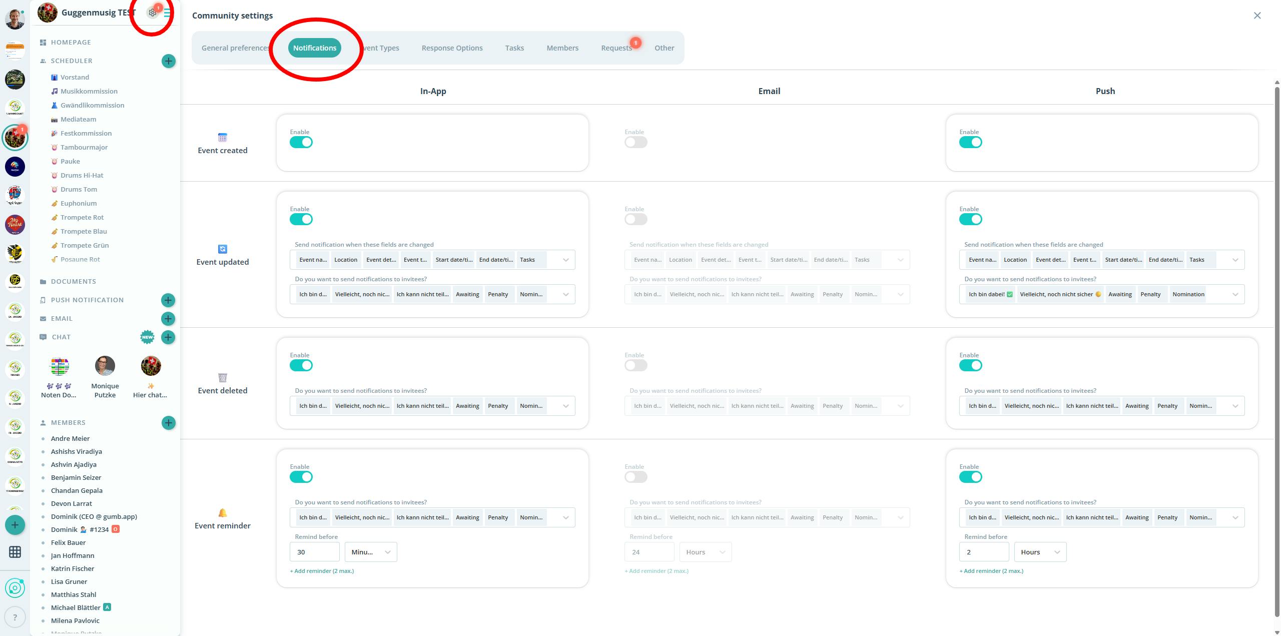 Gumb automatically sends push or email notifications - for example when events are created, updated, deleted, or reminders are due.