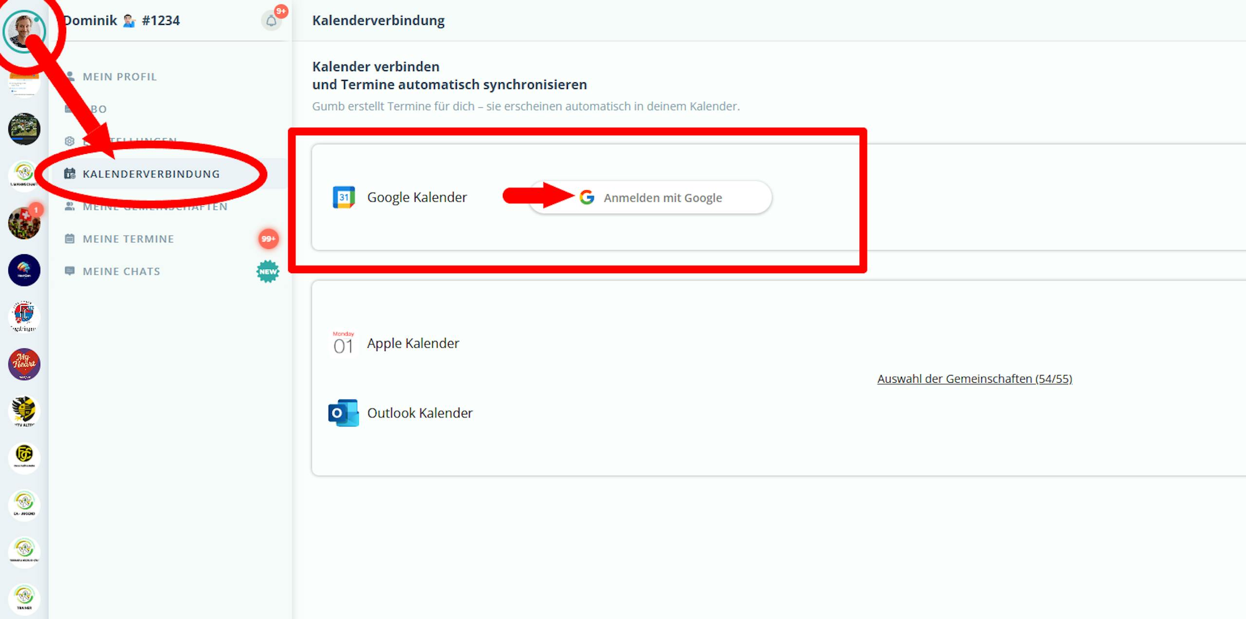 Melde dich einmalig mit deinem Google-Konto unter „Kalenderverbindung“ in deinem Gumb-Profil an und aktiviere die Verbindung.